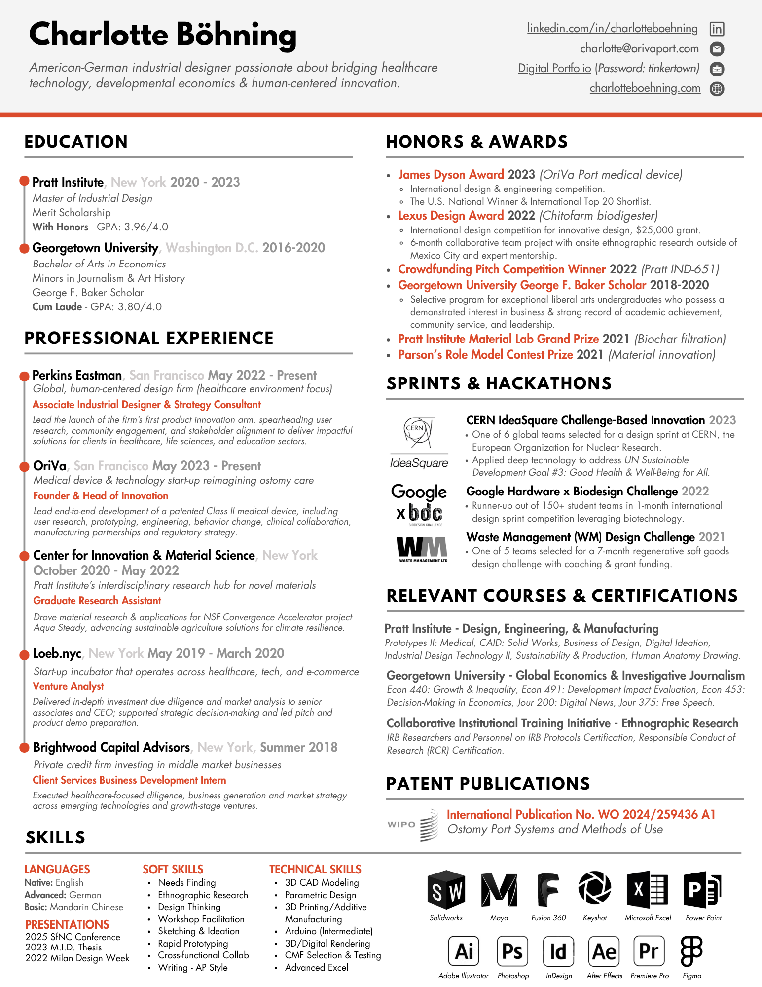 I graduated with a Master’s in Industrial Design from the Pratt Institute in 2023 and earned a Bachelor’s degree in Economics (with a double minor in Journalism and Art History) at Georgetown University. Through my studies, I have worked hard to cultivate an empathetic mindset, an intersectional view of the world, and a desire for lifelong learning.