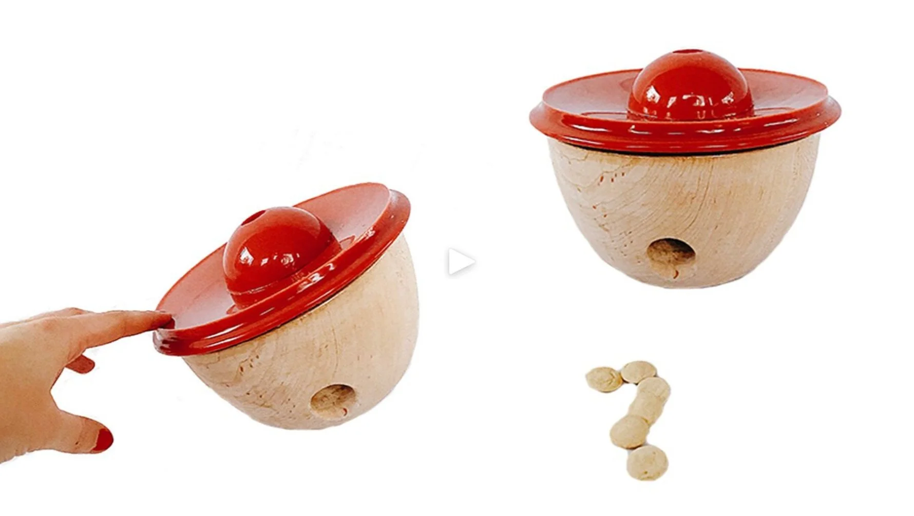 The “pup parent” places treats through the top dome & places the toy in front of the pup. The curious pup then nudges, taps & smacks the toy so that it wobbles and releases gratifying snacks.